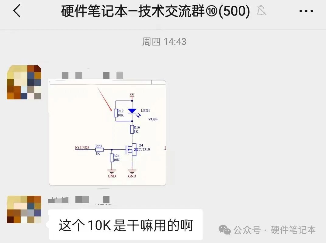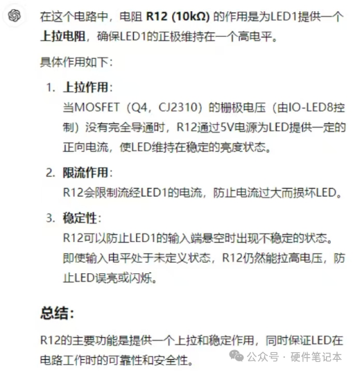 说实话,这不就是点亮一颗LED吗?通过控制MOS栅极的高低电平,从而控制LED的亮灭,一般的电路都不会加这颗电阻R12,我也没见过有这么用的。来看看群里都是怎么回复的:回复2:个人觉得,开通时10k相对二极管是高阻,被旁路,关断时为二极管反向恢复提供续流路径,同时衰减反向恢复的能量。回复3:我见过类似的设计,设计的人跟我说是为了防止灯坏了电路无法工作了。回复4:这位兄弟用上了chatgpt,截图如下