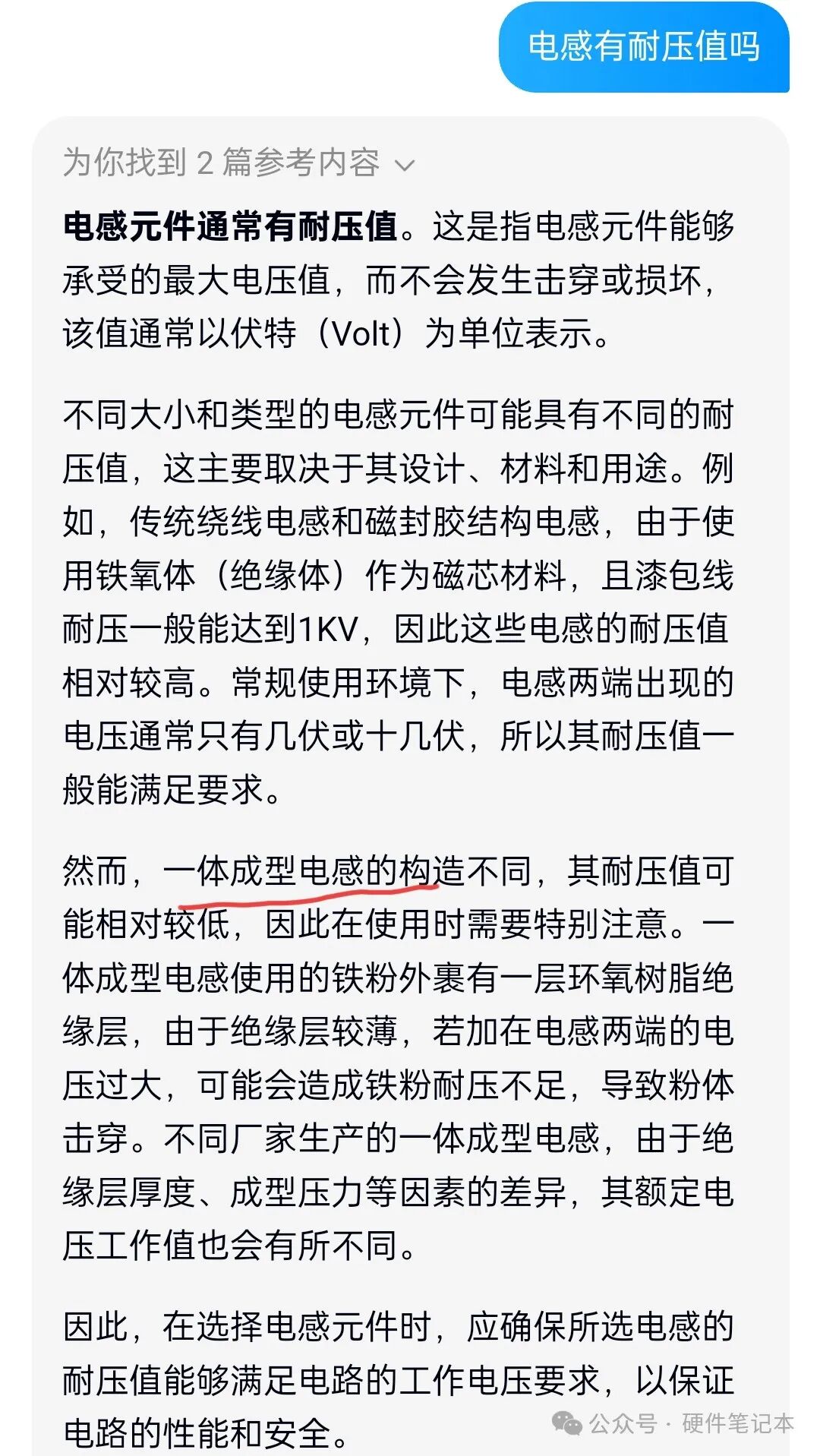 它告诉我们电感是有耐压值的,一般电感耐压值很高,但是一体成型电感的构造不同,其耐压值可能相对较低,选型时要特别注意。