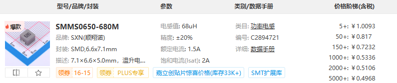 厂家:SXN(顺翔诺),电感型号SMMS0650-680M,耐压30VDC。
