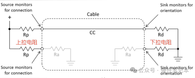 在source端的CC pin有上拉电阻Rp,在sink端有下拉电阻Rd。