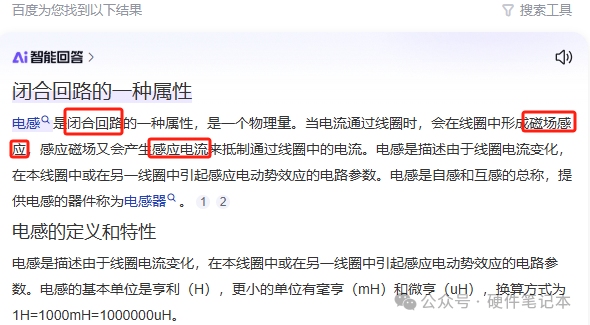 我们先来看第一点,寄生电感怎么来的?先来百度什么是电感,从最基础的开始抓起从定义可以总结出两点:1、闭合回路;2、感应电流。也就是说只要在闭合回路中,导线上的电流发生变化,就会产生变化的磁场,而变化磁场又会产生反向电场来阻止电流变化,这种属性就是电感,所以我们的电路中都会存在寄生电感。