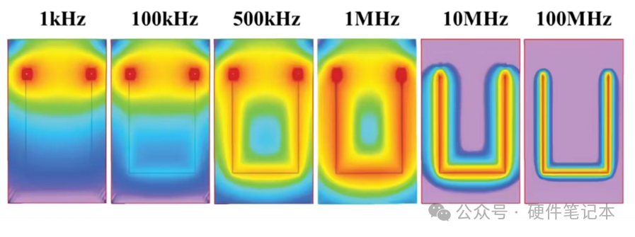 对于低频信号来说,信号会沿着阻抗最低的路径返回,这句话毋庸置疑。但是高频信号这么说就不一定对,随着信号频率的提高,导线的感抗逐渐加大,所以返回路径为感抗最低的回路,且集中在信号走线的下方,沿着PCB走线方向流动,大家可以看看下面这张图。