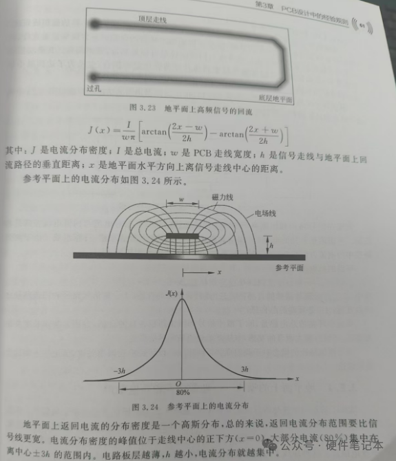 再通过一个公式和电流分布图,可得出:返回电流主要分布在走线中心的正下方,而且电流板层越薄,也就是信号跟地平面越靠近,电流分布就越集中。