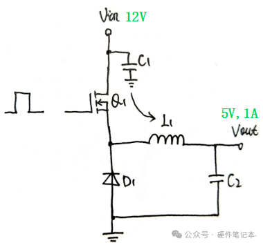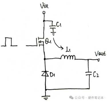 如下图,一个降压电路,它是由MOS开关管Q1、电感L1、二极管D1和电容组成。
