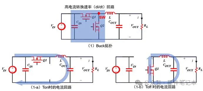 首先,以最简单的BUCK电路拓扑为例,下图(1-a)和(1-b)中分别标明了在上管开通和关断时刻电流的走向,即功率回路部分。这部分电路负责给用户负载供电,承受的功率较大。
