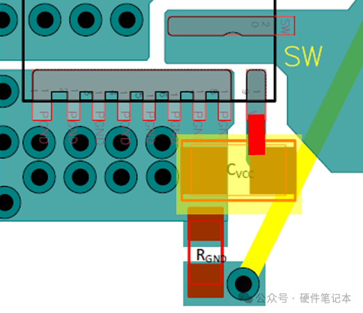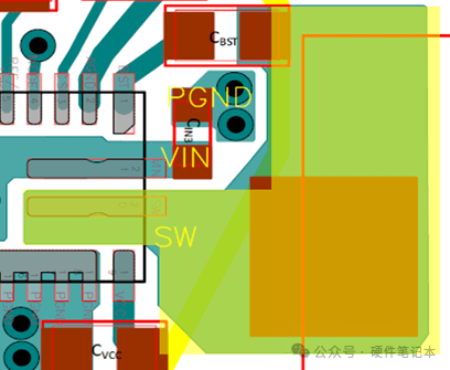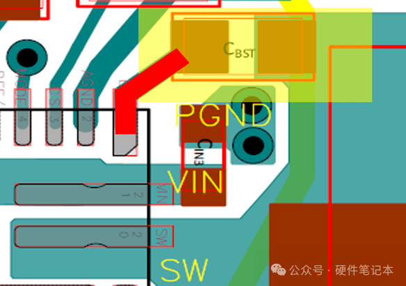 SW 点是噪声源,保证电流的同时保持尽量小的面积 ,远离敏感的易受干扰的位置,例如FB等。
