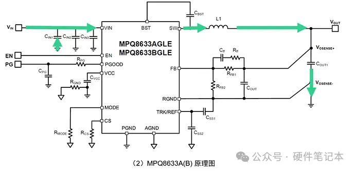 了解了高电流转换速率部分后,让我们回到整个功率回路布局来看。以MPS的非常受欢迎的MPQ8633A(B)系列产品为例,这是一款完全集成的高频同步降压转换器可以实现高达12-20A的输出电流,其原理图如下,其功率回路(绿色标注)中包含输入电容,电感以及输出电容等器件。