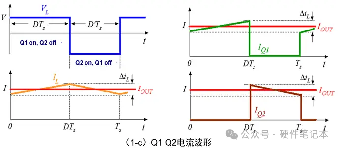 结合图(1-c)中Q1和Q2的电流波形,不难发现,由于电感的存在,后半部分电路中不会存在一个较高的电流变化趋势,只有在两个开关管的部分会出现高电流转换速率。在PCB布线时需要特别注意,尽可能减小这一快速变化的环节的面积,来减少对其他部分的干扰。随着集成工艺的进步,目前大部分电源芯片都将上下管集成到了芯片的内部。
