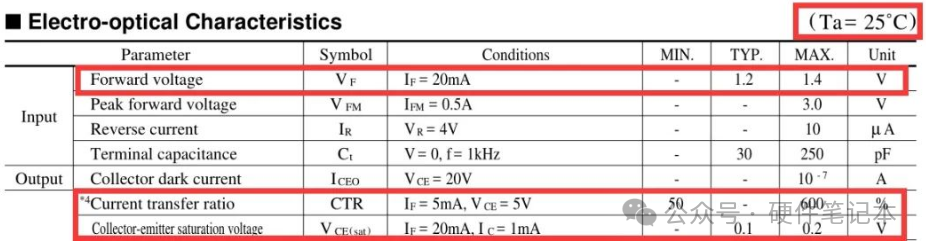 打开datasheet,有几个参数需要重点关注一下,一会用得着:1、VF光耦输入二极管的导通压降,我们取最大值1.4V;