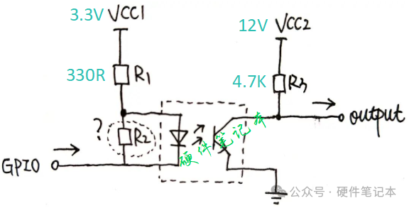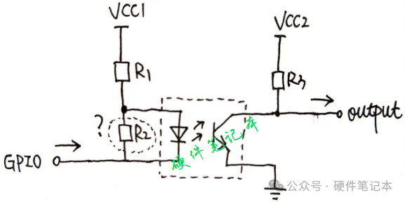 当GPIO为低时,光耦导通,输出output为低。1、光耦输入端并一个电阻有什么用?