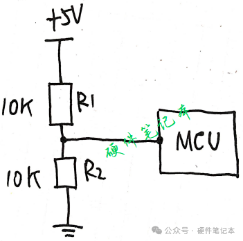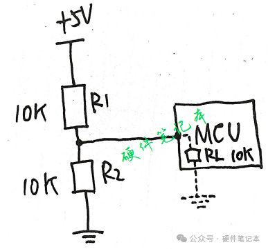 通过计算后可知,分压后传输给ADC的电压为2.5V。但实际上ADC端,也就是在我们MCU的内部也有一个电阻,这个电阻将会改变送到ADC端的电压,导致采集到的数据不是那么的准确。