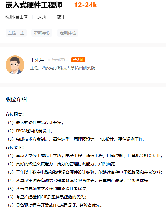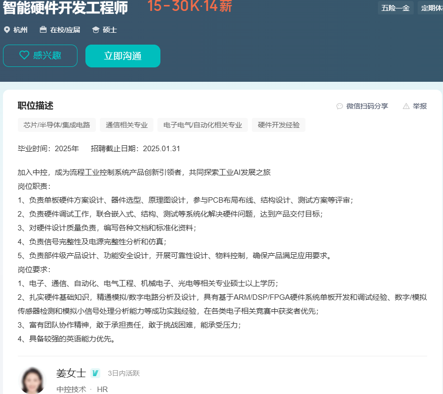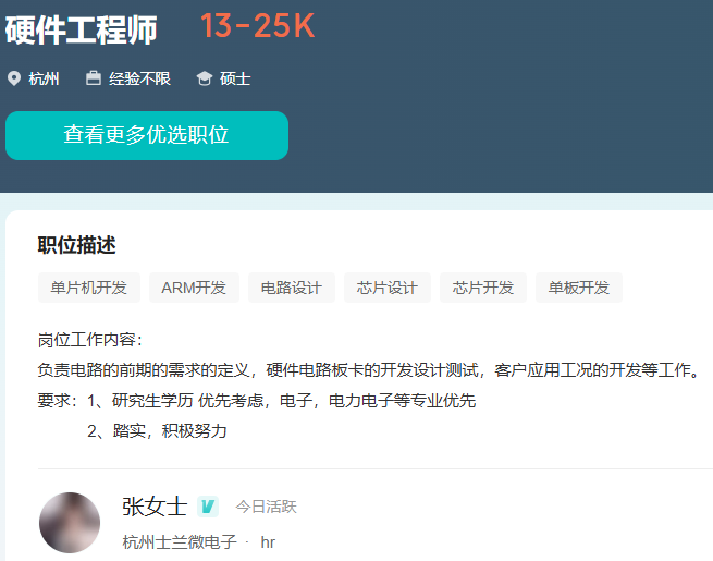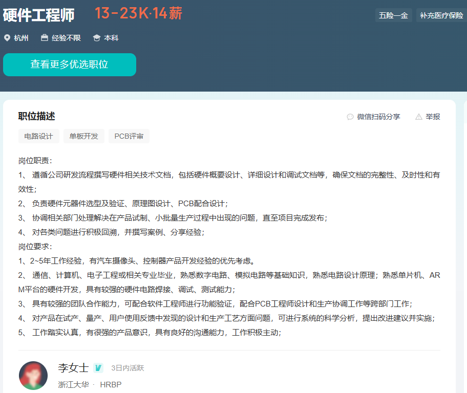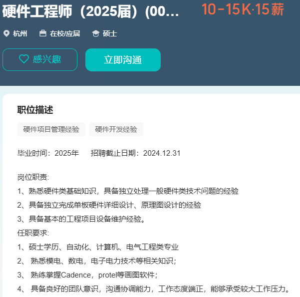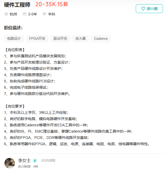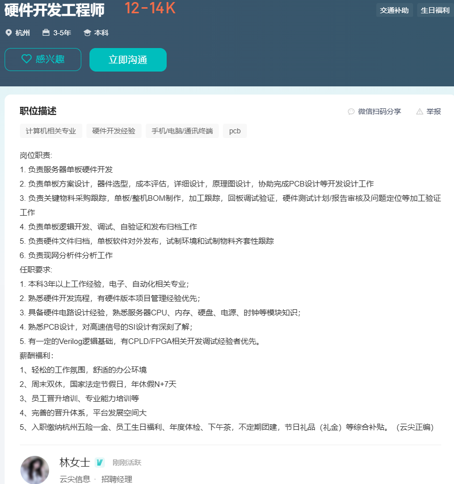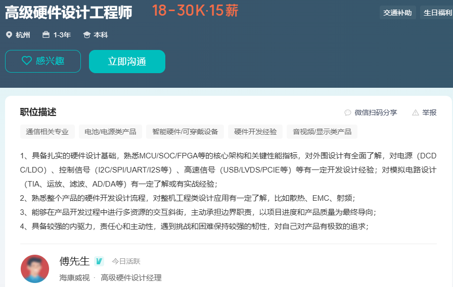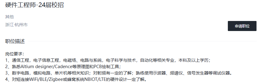 目前在杭州有硬件研发工程师的需求,负责公司硬件产品的硬件设计与开发。