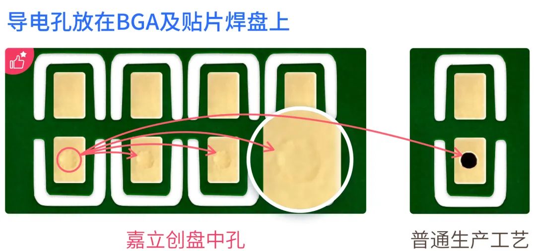 简单说,这种工艺最大的优点就是把过孔打在焊盘上。要知道公司之前是不允许这样操作的,且要求过孔与焊盘的距离>0.15mm。过孔打在焊盘上,我觉得有点意思,于是专门去搜了一下,发现确实可以这样做,在嘉立创打板就行。