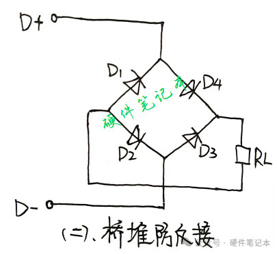 当电源正极从D+输入时,经回路D+→RL→D-,形成一个回路,负载RL正常工作。当电源正极从D-输入时,由于二极管D1的单向导通性,D1截止,回路不同,负载不工作。从而起到防反接的作用。