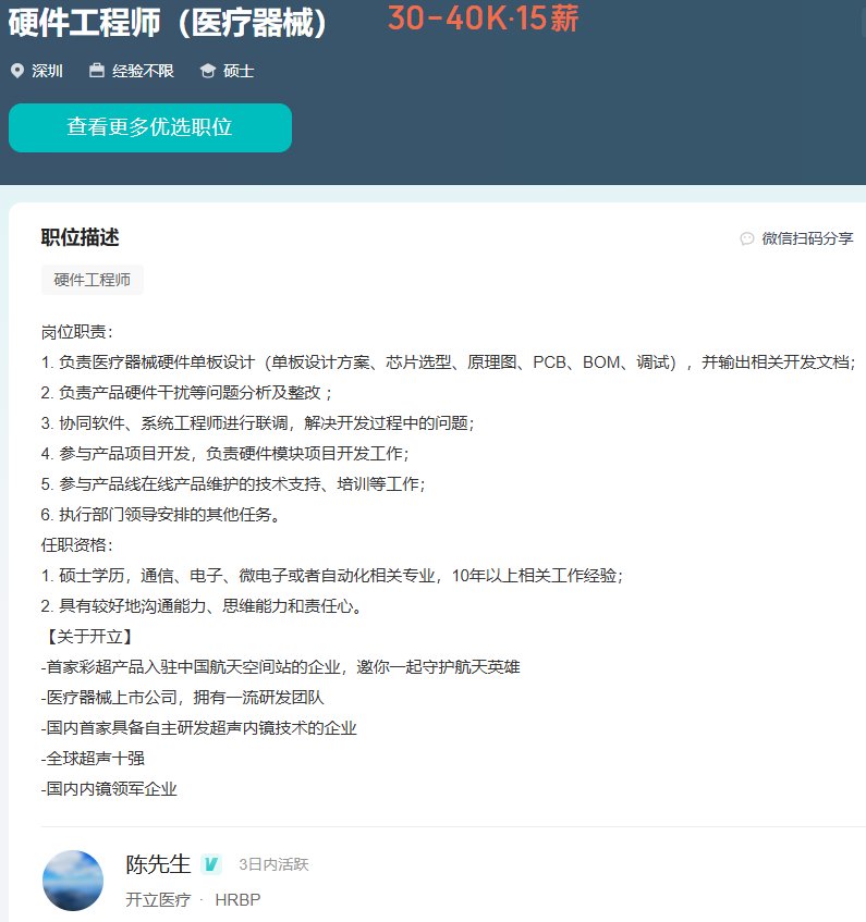 公司自2002年成立以来一直致力于医疗设备的研发和制造,产品涵盖超声诊断系统、电子内镜系统和体外诊断系列三大产品线。目前公司在美国硅谷、西雅图,日本东京以及中国的深圳、上海、哈尔滨、武汉设有七大研发中心。他们之前发过一个深圳硬件工程师的招聘,大家可以参考