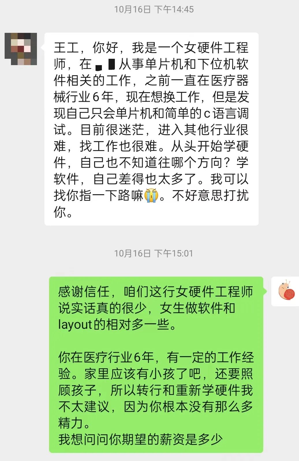 这两位同学其实都已经工作几年了,王工也跟他们简单聊了一下,大概想表达的意思首先是考虑自己的家庭,即使你对目前自己的行业或者工作不满意,至少还有一口饭吃。硬件这个专业在短时间内是挣不了钱的,前期你需要花费大量的时间去摸索,工资也很低,没有必要一下子就转行来硬件,特别是工作几年再转行。对于刚毕业不久,没有家庭的人来说,还可以慢慢磨一下。如果你真的想好了要转,最好先把这些可能产生的后果想清楚了再说。
