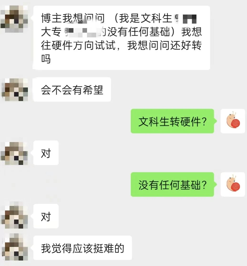 前段时间好多人加我微 信,问我硬件入门是不是很难,印象比较深刻的是下面两个同学。为了保护他们的个人隐私,我划掉了他们的关键信息。