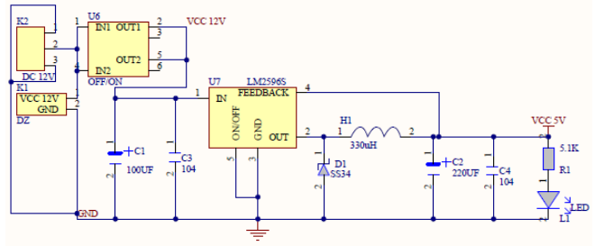 比如下面的电路图,它主要实现的功能是从12V降压到5V。用到的元件有电阻,电容,电感,稳压二极管,LED和DC/DC降压芯片,还有连接器。首先要知道每个元件的作用和特性,还有元件值大小,以及为什么要这样设计,这些都是有讲究的。