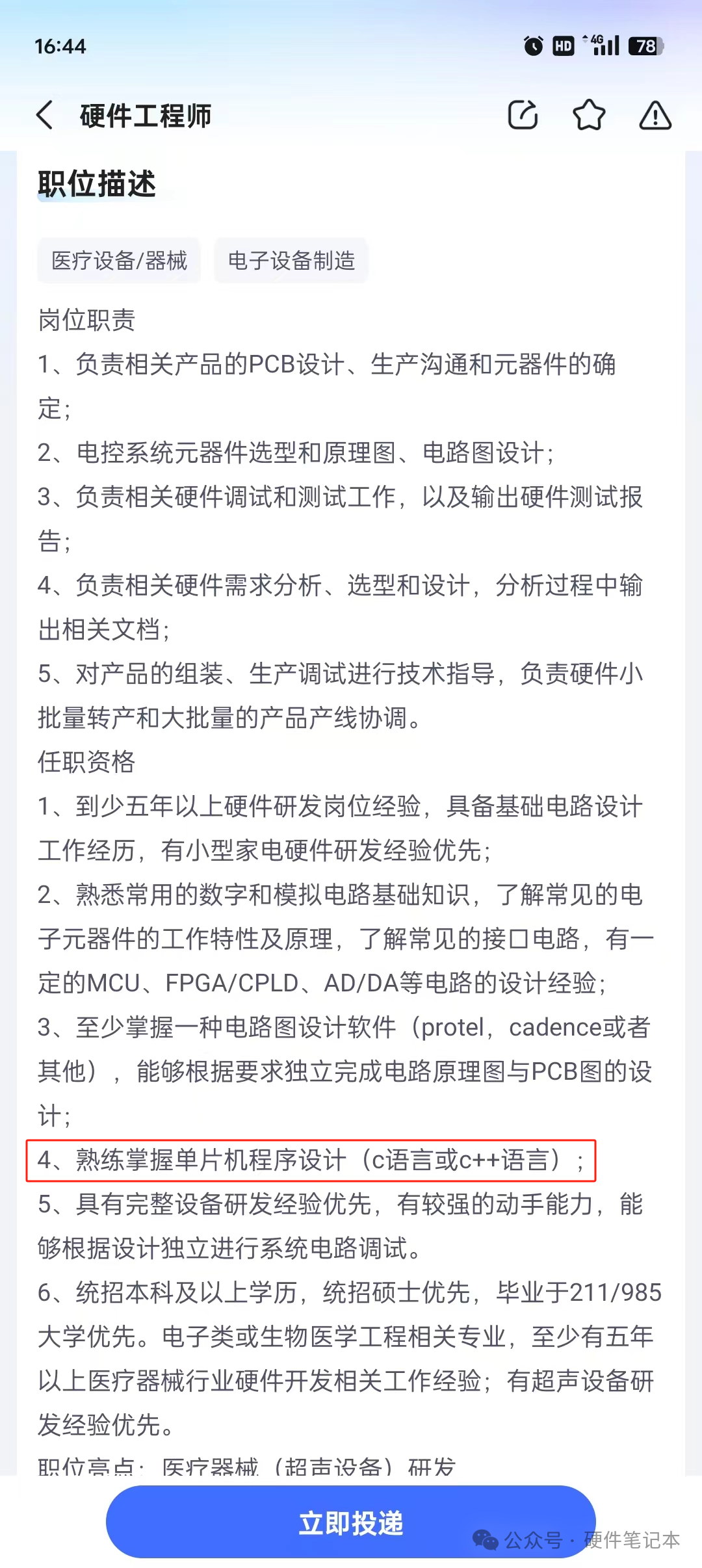 我在网上大概都找了一下硬件工程师的岗位招聘要求,发现大多数公司其实没有要求硬件工程师会写代码,少部分会有要求。如下左图,明确要求熟练掌握单片机程序设计。