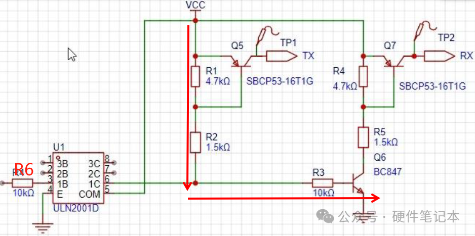 请大家看红色箭头所示回路,为什么要看这条回路呢?你想啊,你的目地是改变三极管Q5的开关,但是你发现没,无论输入电平怎么变化,三极管Q5完全没受控制,一直导通。那为什么不受控呢?那是因为三极管基极电压再怎么变化,Vbe压差始终>0.7V,你让他压差<0.7V不就行了,通过计算<300R可实现功能。