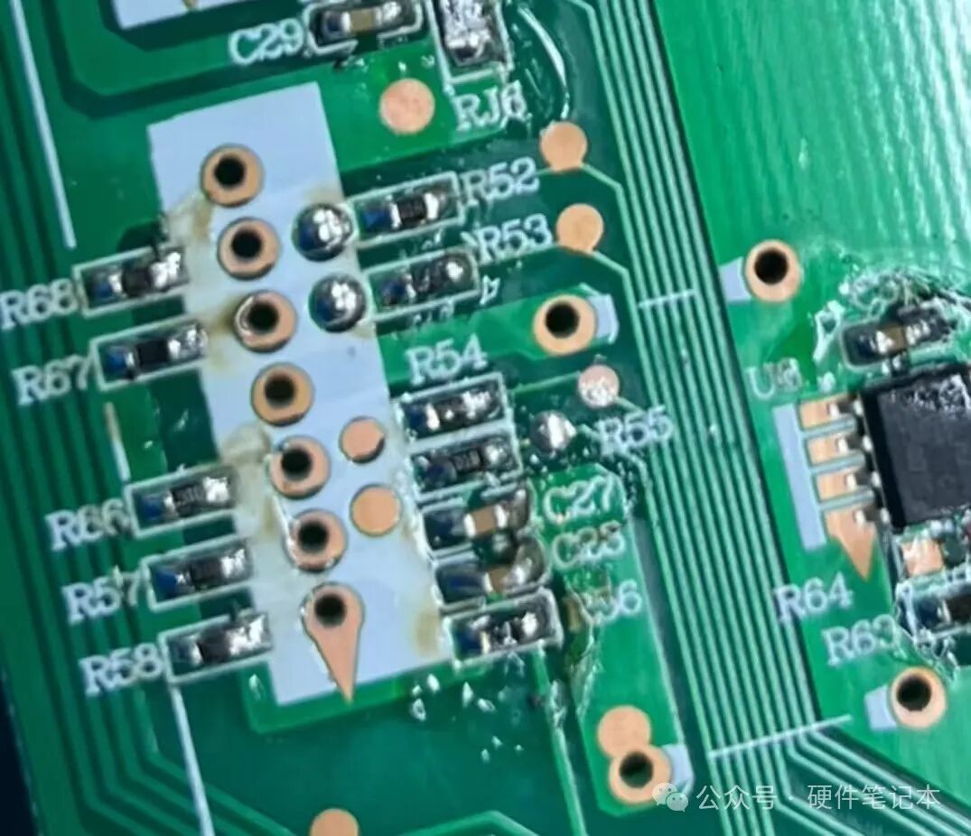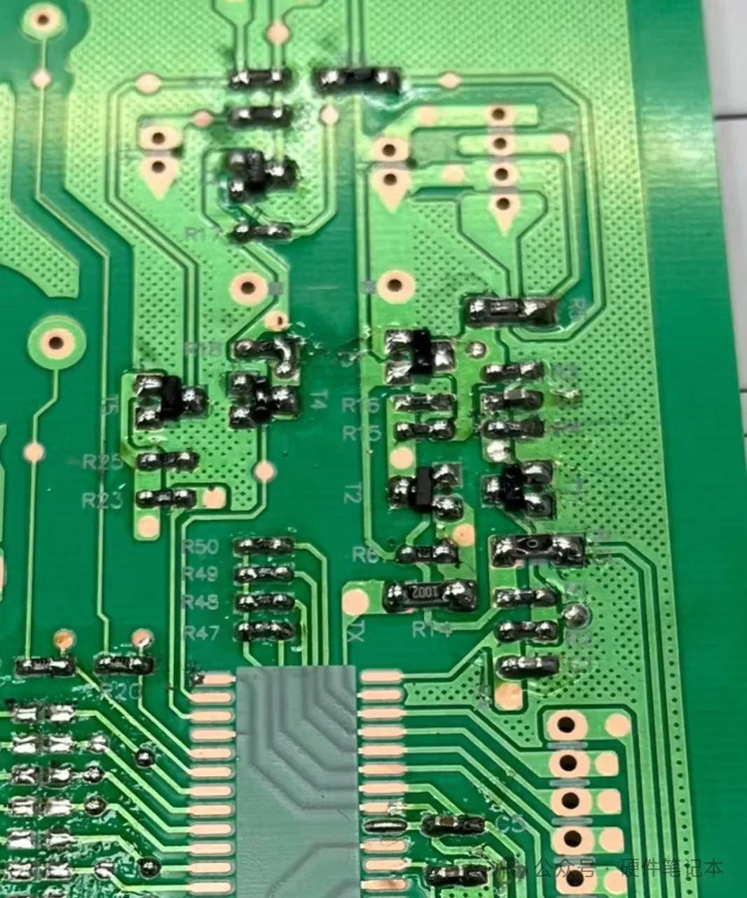 这个电阻好小好小,好难控制锡量,容易搞多。ps:这一大坨焊锡,比电阻本身还大啊