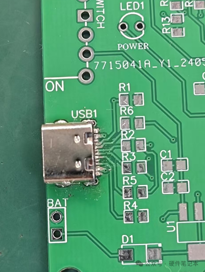 同学12:TYPE-C引脚间距太近,不太好焊,上锡太少,看起来有点虚焊。ps:咋不用助焊剂啊兄弟。
