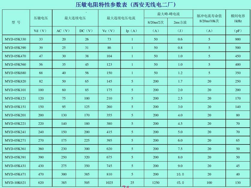 (7)绝缘电阻。对8/20us电流波的单次最大放电电流。对50Hz交流电,能经受连续9个周波的最大电流的有效值。