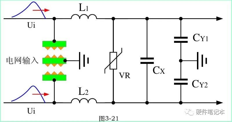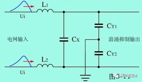 一般CX电容可承受4000Vp的差模浪涌电压冲击,CY电容可承受5000Vp的共模电压冲击。正确选择L1、L2和CX2、CY参数的大小,就可以抑制4000Vp以下的共模和差模浪涌电压。但如果两个CY电容是安装在整机线路之中,其总容量不能超过5000P,如要抑制浪涌电压超过4000Vp,还需选用耐压更高的电容器,以及带限幅功能的浪涌抑制电路。