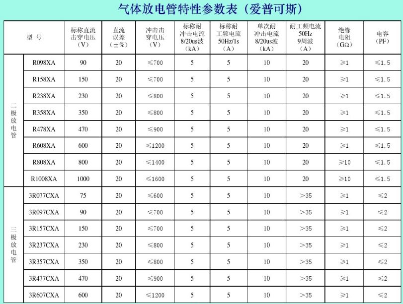 (8)电容。放电管电极间的电容,一般在2~10pF之间,是所有瞬变干扰吸收器件中最小的。