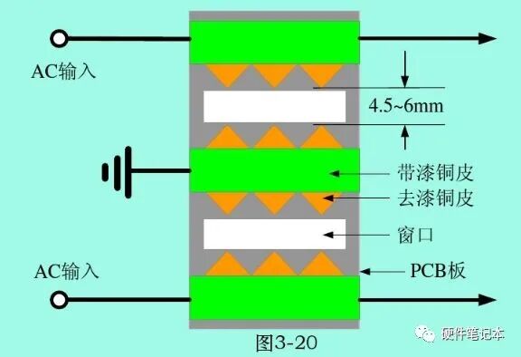在PCB板上直接制作放电避雷装置,可以代替防雷放电管,可以抑制数万伏共模或差模浪涌电压冲击,避雷装置电极之间距离一般要求比较严格,输入电压为AC110V时,电极之间距离可选4.5mm,输入电压为AC220V时,可选6mm;避雷装置的中间电极一定要接到三端电源线与PCB板连接的端口上。