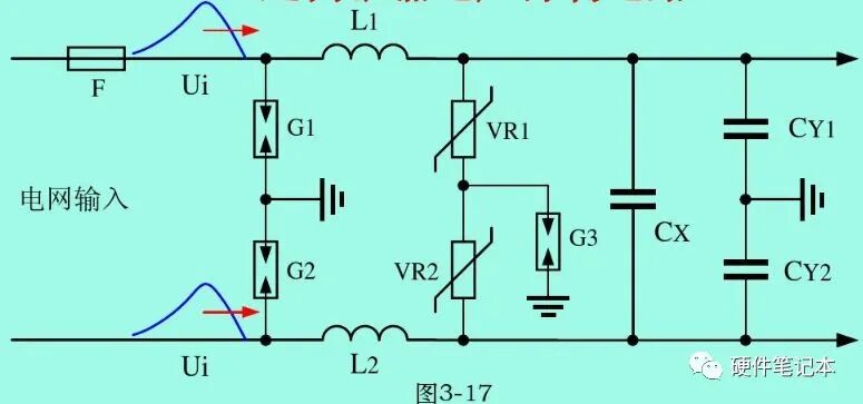 对4000Vp以下的浪涌电压进行抑制,一般只需采用LC电路进行限流和平滑滤波,把脉冲信号尽量压低到2~3倍脉冲信号平均值的水平即可。电感很容易饱和,因此,L1、L2一般都采用一种漏感很大的共模电感。