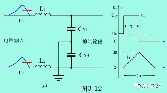 图(a)中L1与CY1、 L2与CY2,分别对两路共模浪涌电压进行抑制,计算时只需计算其中一路即可。Ø对L1进行精确计算,须要求解一组2阶微分方程,结果表明:电容充电是按正弦曲线进行,放电是按余弦曲线进行。但此计算方法比较复杂,这里采用比较简单的方法。