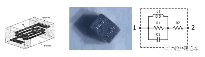 图3 :磁珠示意图(左)、实物图(中)、等效电路图(右)