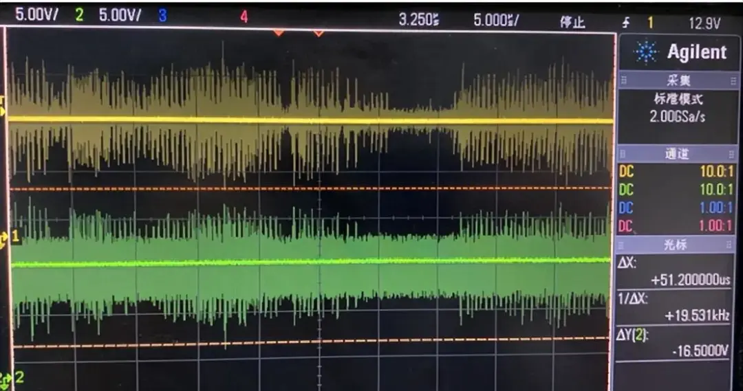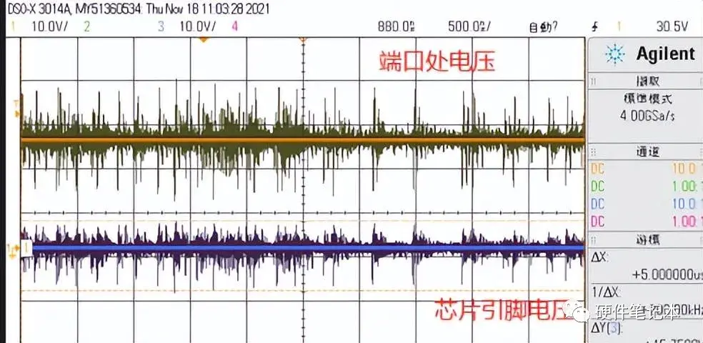由于保险、TVS、电源芯片都没有损坏,基本上可以排除过流的情况,结合客户的现场应用,客户使用DC24V供电,DC24V上同时挂载了50多个交流接触器,用于过程控制,接触器的动作频率约1次/S。经过现场工程师的示波器测试,现场捕捉到非常高的浪涌干扰。在电源端口处最高可以测试到DC57V、60MHZ左右的脉冲干扰。断开接触器后,该干扰消失,说明是有与接触器导致的干扰。
