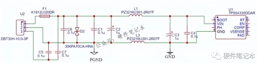 第五级为滤波方案,如图E,滤波放置于TVS后级,为后级的电源芯片提供最后的滤波已经储能应用。