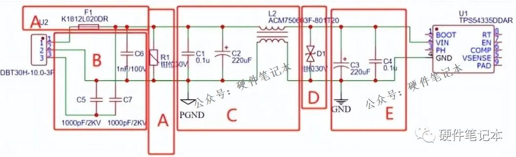 第一级为滤波方案,由图B组成,其中C5、C7使用C1812/1nF/2kV的陶瓷电容组成,选用这么大封装主要是由于做涌浪测试时,由于电容并非理想电容,内部有ESR,高压下电容会发热,因此需要较大封装的电容提高流通能力,C6为差模滤波,主要的流通途径有压敏电阻R1以及后级的电解电容等,因此封装C0805,耐压100V即可。