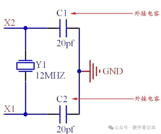 晶振的外接电容,为两颗,一般区间是6PF~30PF。它们会直接影响晶振频率的精度。这两颗电容需要接地, 其原理是实现电容的分压作用。电容值越小,晶振频率越偏正向。同理,电容值越大,晶振频率越偏负向。