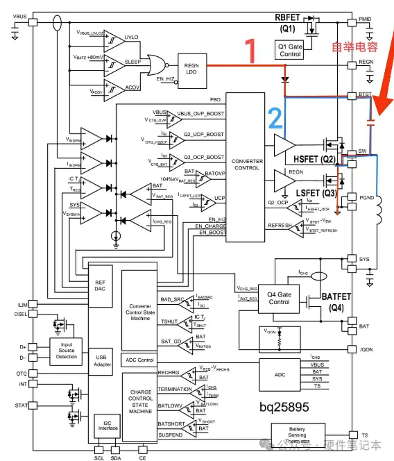 自举电容是利用电容两端电压不能突变的特性,先给电容充电,再叠加在另一个电压上来获取一个更高的电压。