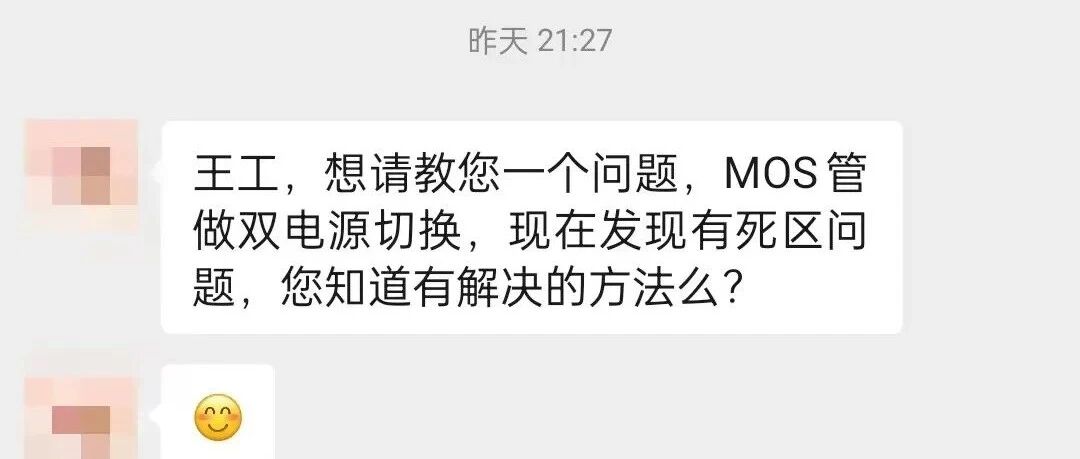 大家好,我是王工。这是微 信上一个兄弟找的我,说他电路调试时有问题,问我有没有可以解决的办法。下面是部分聊天截图。通过交谈,我把他的需求梳理了一下:设备有两组供电电源,一组是主电源,另一组是辅助电源。主电源和辅助电源同时供电,优先使用主电源,当主电源断电后,辅助电源无缝衔接给设备供电。然后呢,网上有一个推荐电路如下图:这个电路是怎么工作的呢?电路分析: 1、当主电源Vin1为3.3V时,Q1的NMOS导通,然后Q3 PMOS的栅极被拉低, Q3 导通,Q2 MOS管关闭,外部电源Vin2断开,VOUT由Vin1进行供电。2、当主电源Vin1断开,Q1 NMOS截止,Q2 PMOS的栅极通过R1下拉,Q2导通,Q3 PMOS的栅极通过R2上拉,Q3截止。VOUT由外部电源Vin2供电。通过分析看来,好像电路没什么问题,主备切换可行。但是在实际调试过程中发现主电源在下降的过程中,Q1和Q3不能及时断开,导致Q2只能通过体二极管导通,有0.5V的压降。Q3不能完全关断,而Q2就开始导通,外电源通过Q2、Q3形成通路,进一步阻止主电源的降低。相当于Q2永远不能导通,一直都是体二极管在导通。这就很严重了,相当于MOS管Q2一直没工作,整个电路就没啥用。问题出来了,那是什么原因导致的呢?其实就是主电源在下降的过程中Q1,Q3没有及时关断导致出现一系列问题,那是什么原因导致这两个管子关闭这么慢呢?两种可能:1、主电源本身掉电比较慢,从而引起管子慢关断;2、MOS管选型不对,Ciss寄生电容太大(感觉又不大可能,现在管子寄生电容都做的很小,应该影响不大)。至于怎么优化电路,两种方法:1、让主电源快速掉电;(怎么做到?)2、让辅助电源慢速上电。(很难,而且不太好)这个例子也给大家提个醒:网上的电路不能随便拿来用,自己最好先验证一下再用。最后,这位兄弟板子已经打回来了,各位有比较好的优化建议,或者更好的电路分享,可以留言或加扫下方二维码,加微 信告诉我,谢谢大家。声明: 声明:本号对所有原创、转载文章的陈述与观点均保持中立,推送文章仅供读者学习和交流。文章、图片等版权归原作者享有,如有侵权,联系删除。 来源:硬件笔记本