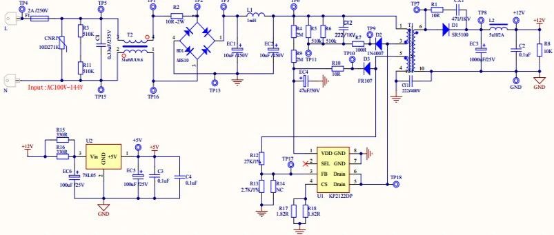 一、整体概括下图是一个反激式开关电源的原理图。输入电压范围在AC100V~144V,输出DC12V的电压。开关电源的思路:要实现输出的稳定的电压,先获取输出端的电压,然后反馈给输入端调控输出功率(电压低则增大输出功率,反之则减小),最终达到一个动态平衡,稳定电压是一个不断反馈的结果。 二、瞬变滤波电路解析市电接入开关电源之后,首先进入瞬变滤波电路(Transient Filtering),也就是我们常说的EMI电路。下图描述的是本次举例说明的瞬变滤波电路的电路图。各个器件说明: F1-->保险管:当电流过大时,断开保险管,保护电路。 CNR1-->压敏电阻:抑制市电瞬变中的尖峰。 R31、R32-->普通贴片电阻:给这部分滤波放电,使用多个电阻的原因是分散各个电阻承受的功率。 C1-->X电容:对差模干扰起滤波作用。 T2-->共模电感:衰减共模电流。 R2-->热敏电阻:在电路的输入端串联一个负温度系数热敏电阻增加线路的阻抗,这样就可以有效的抑制开机时产生的浪涌电压形成的浪涌电流。当电路进入稳态工作时,由于线路中持续工作电流引起的NTC发热,使得电阻器的电阻值变得很小,对线路造成的影响可以完全忽略。三、整流部分各个器件说明: BD1->整流桥:作用应该知道。。 L1、EC1、EC2->π型LC滤波电路,主要起的就是滤波,使输出的电流更平滑。 四、开关电源主体部分开关电源的主题部分如下图 五、输出端滤波电路下图是输出端滤波电路。 声明: 声明:文章来源网络。本号对所有原创、转载文章的陈述与观点均保持中立,推送文章仅供读者学习和交流。文章、图片等版权归原作者享有,如有侵权,联系删除。 来源:硬件笔记本