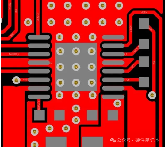 QFN 器件封装边缘四周的板避免在顶部使用铜层吸收热量。必须使用热通孔将热量驱散至内层或 PCB 的底层。