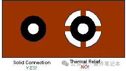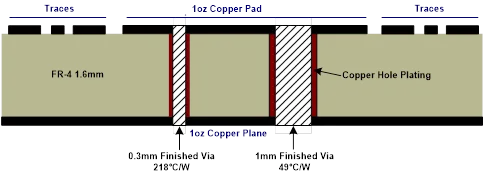 过孔具有热阻,这就意味着每当热量流经时,过孔两端会有一定温差,其测量单位为摄氏度/每瓦特。所以,为最大限度地降低热阻,提高过孔的散热效率,过孔应设计大一点,且孔内的覆铜面积越大越好(见图2)。