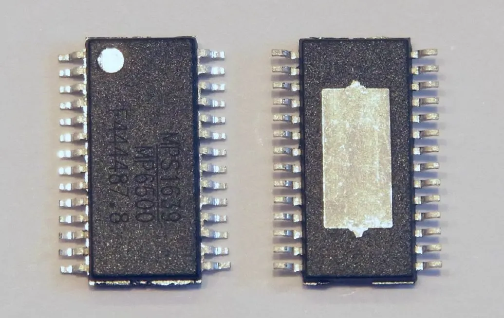 TSSOP 封装为长方形,并使用两排引脚。电机驱动器 IC 的 TSSOP 封装通常在封装底部带有一个较大的外露板,用于排除器件中的热量(图9)。