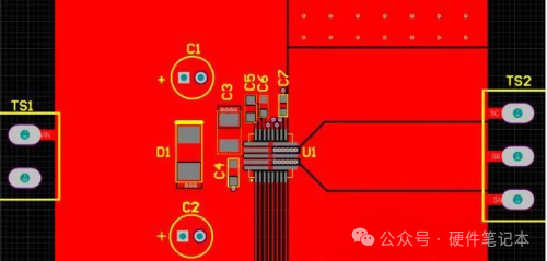 器件左侧的铜区域为功率输入口。这个较大的铜区域直接连接至器件的两个电源板。