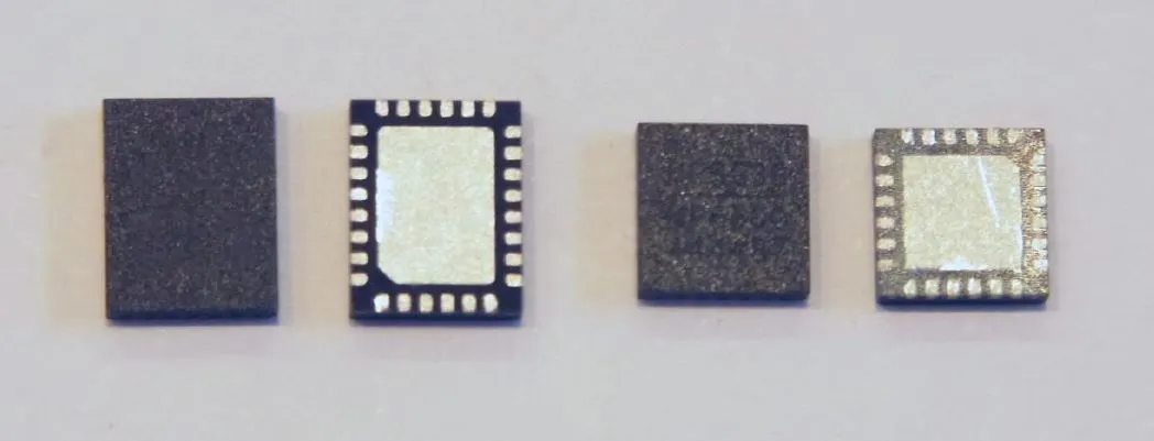 倒装芯片 QFN (FCQFN) 封装与常规的QFN封装类似,但其芯片采取倒装的方式直接连接至器件底部的板上,而不是使用接合线连接至封装板上。这些板可以置于芯片上的发热功率器件的反面,因此它们通常以长条状而不是小板状布置(见图13)。