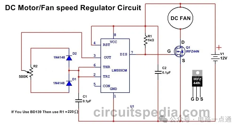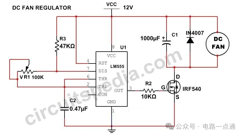 通过使用此电路,您可以通过调节(电位器)音量控制可变电阻来控制直流风扇的速度。这些电路基于 555 定时器。