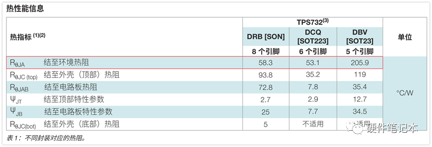 例如,TPS732 根据封装不同而具有不同的热阻值:小外形晶体管 (SOT)-23 (2.9mm x 1.6mm) 封装的热阻为205.9°C/W,而 SOT-223 (6.5mm x 3.5mm) 封装的热阻为 53.1°C/W。这意味着 TPS732 每消耗1W 功率,温度就会升高 205.9°C 或 53.1°C。这些值可参见器件数据表的“热性能信息”部分,如表 1 所示。