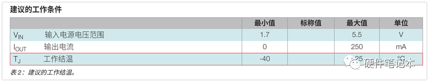 建议的 LDO 工作结温介于-40°C 至 125°C 之间;同样,可以在器件数据表中查看这些值,如表 2 所示。