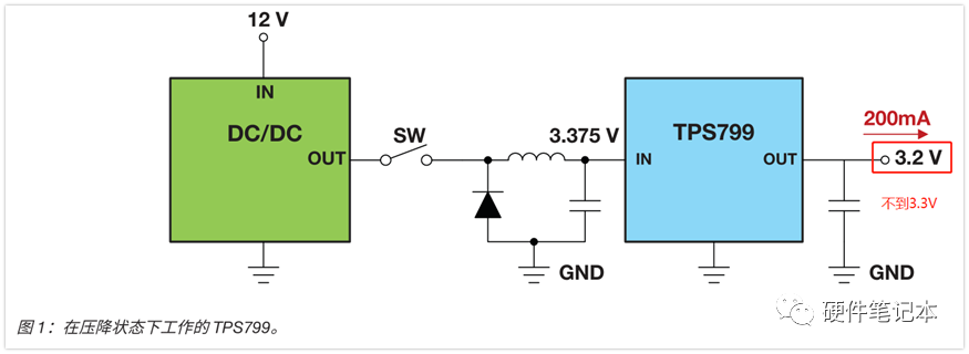 以调节后电压为 3.3V 的 TPS799 等 LDO 为例:当输出200mA 电流时,TPS799 的最大压降电压指定为 175mV。只要输入电压为 3.475V 或更高,就不会影响调节过程。但是,输入电压降至 3.375V 将导致 LDO 以压降状态工作并停止调节,如图 1 所示。