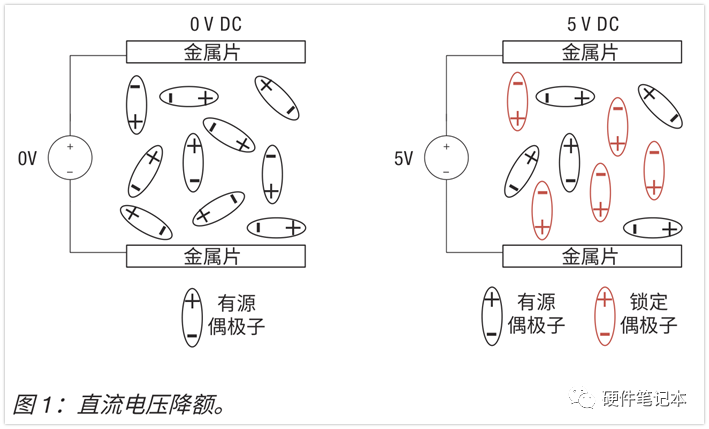 如图1所示,锁定的偶极子不会对交流电压瞬变作出反应;因此,有效电容低于施加直流电压前的值。